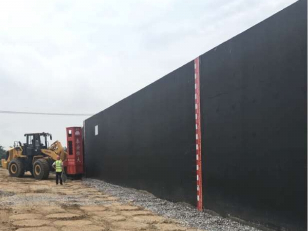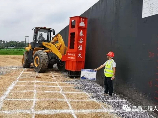 層厚標(biāo)記采用定制15cm紅白相間的反光貼紙控制層厚,并公示臺背責(zé)任卡,使用高速液壓夯實機進行夯實,提高涵背填筑質(zhì)量。